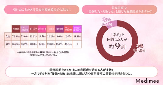 今回の調査から、美容医療は身近な選択肢として広がっている一方で、施術やクリニック選びにおいて後悔や失敗を感じた経験がある人も多いことが明らかになりました。