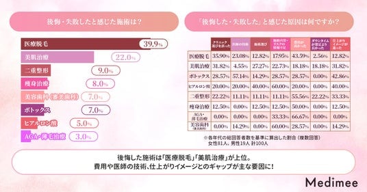 後悔・失敗したと感じた施術としては、「医療脱毛」が約4割と最も多く、次いで「美肌治療」「二重整形」「痩身治療」などが続く結果となりました。比較的多くの人が経験した施術ほど、期待値とのギャップや満足度の差が生じやすい傾向がうかがえます。