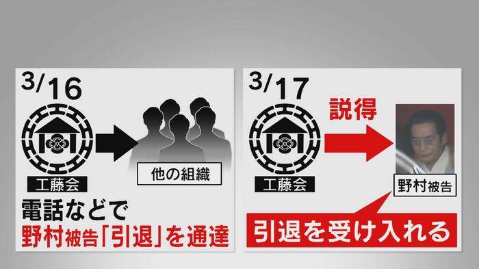 組織の内情に詳しい人物によると工藤会が野村被告の引退を決めたのは3月16日。その日のうちに、ほかの組織に向けて野村被告の引退を通達したという。そして翌17日に野村被告の説得にあたり、本人も受け入れたということだ。