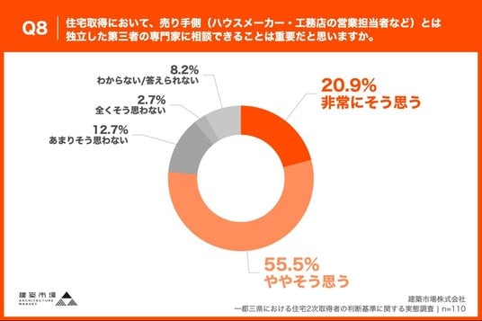 「Q8. 住宅取得において、売り手側(ハウスメーカー・工務店の営業担当者など)とは独立した第三者の専門家に相談できることは重要だと思いますか。」(n=110)と質問したところ、「非常にそう思う」が20.9%、「ややそう思う」が55.5%という回答となりました。