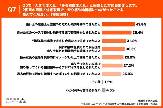「Q7. Q5で「大きく変えた」「ある程度変えた」と回答した方にお聞きします。2回目の戸建て住宅取得で、安心感や納得感につながったことを教えてください。(複数回答)」(n=66)と質問したところ、「設計士や建築士と直接やり取りし疑問を解消できたこと」が43.9%、「自分たちのペースで検討し納得するまで時間をかけられたこと」が39.4%、「判断基準を家族で共有し合意の上で決定できたこと」が31.8%という回答となりました。