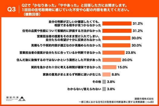 「Q3. Q2で「かなりあった」「ややあった」と回答した方にお聞きします。1回目の住宅取得時に感じていた不安や心配の内容を教えてください。(複数回答)」(n=80)と質問したところ、「自分の判断が正しいか確認したくても、相談できる相手が見つからなかった」が31.2%、「住宅の品質や性能について客観的に評価する方法がなかった」が31.2%という回答となりました。