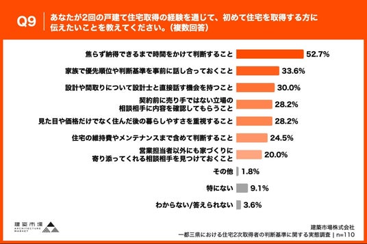 「Q9. あなたが2回の戸建て住宅取得の経験を通じて、初めて住宅を取得する方に伝えたいことを教えてください。(複数回答)」(n=110)と質問したところ、「焦らず納得できるまで時間をかけて判断すること」が52.7%、「家族で優先順位や判断基準を事前に話し合っておくこと」が33.6%、「設計や間取りについて設計士と直接話す機会を持つこと」が30.0%という回答となりました。