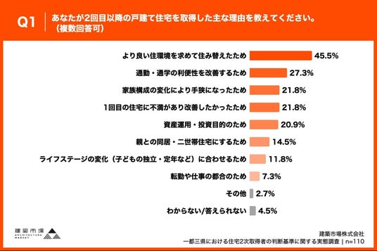 「Q1. あなたが2回目以降の戸建て住宅を取得した主な理由を教えてください。(複数回答可)」(n=110)と質問したところ、「より良い住環境を求めて住み替えたため」が45.5%、「通勤・通学の利便性を改善するため」が27.3%という回答となりました。