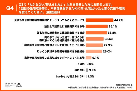 「Q4. Q3で「わからない/答えられない」以外を回答した方にお聞きします。1回目の住宅取得時に、不安を解消するためにあれば助かったと思う支援や環境を教えてください。(複数回答)」(n=77)と質問したところ、「見積もりや契約内容を客観的にチェックしてもらえるサービス」が44.2%、「設計士や建築士に直接質問できる場」が35.1%、「住宅取得の経験者から体験談を聞ける機会」が33.8%という回答となりました。