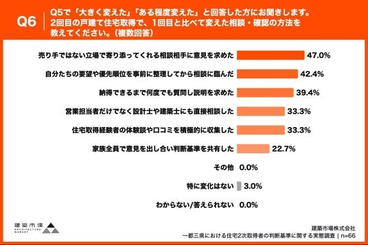 「Q6. Q5で「大きく変えた」「ある程度変えた」と回答した方にお聞きします。2回目の戸建て住宅取得で、1回目と比べて変えた相談・確認の方法を教えてください。(複数回答)」(n=66)と質問したところ、「売り手ではない立場で寄り添ってくれる相談相手に意見を求めた」が47.0%、「自分たちの要望や優先順位を事前に整理してから相談に臨んだ」が42.4%、「納得できるまで何度でも質問し説明を求めた」が39.4%という回答となりました。