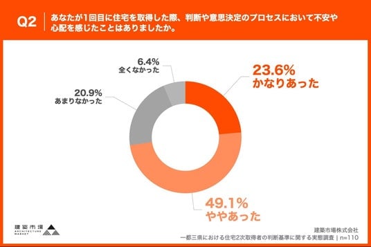 「Q2. あなたが1回目に住宅を取得した際、判断や意思決定のプロセスにおいて不安や心配を感じたことはありましたか。」(n=110)と質問したところ、「かなりあった」が23.6%、「ややあった」が49.1%という回答となりました。