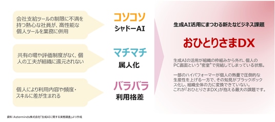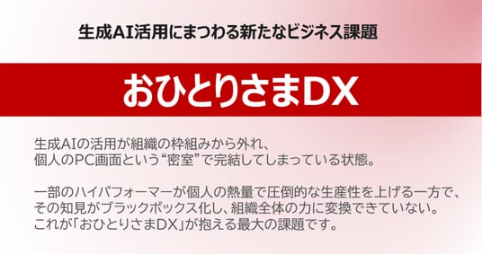本調査により、生成AIの利用が個人のPC画面という"密室"で完結し、組織知に還元されない「おひとりさまDX」という新たなビジネス課題が浮き彫りになりました。