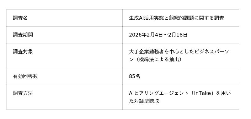 当社は今後もAIヒアリングエージェント「InTake」を活用した調査を継続的に実施し、企業のAI活用における課題と処方箋を発信してまいります。