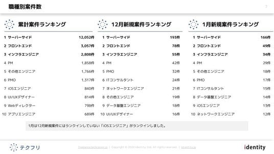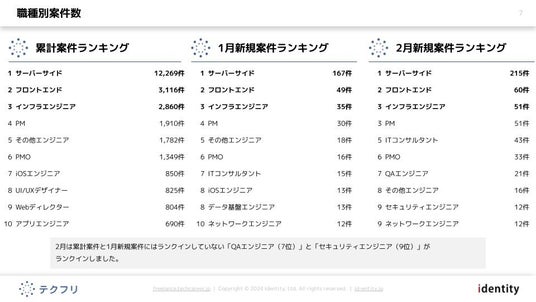 2月は累計案件と1月新規案件にはランクインしていない「QAエンジニア(7位)」と「セキュリティエンジニア(9位)」がランクインしました。