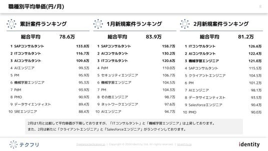 ITフリーランスエンジニアの案件・求人サイト「テクフリ」(https://freelance.techcareer.jp/)を運営する株式会社アイデンティティー(東京都港区、代表取締役:今野 力、以下「当社」)は、テクフリのデータベースをもとに2026年2月における案件の市況感を調査しました。より詳しい結果については、お問い合わせから資料請求が可能です。