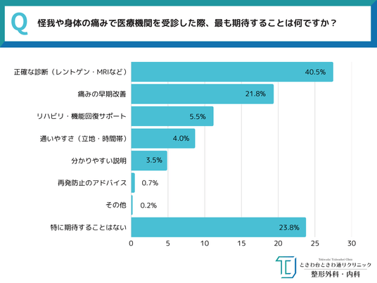 TOP3 1.正確な診断(レントゲン・MRIなど):40.5% 2.痛みの早期改善:21.8% 3.リハビリ・機能回復サポート:5.5%