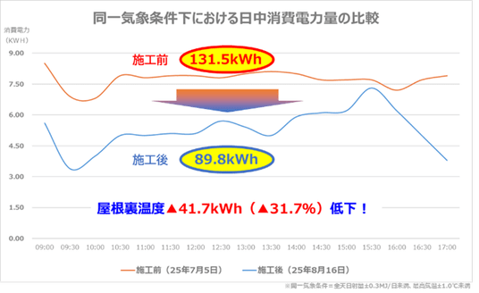ました。更に空調の消費電力においても、同一気象条件下(全天日射量±0.3MJ/日、最高気温差±1.0℃未満)で比較したところ、塗装前後で最大31.7%、平均18.1%(5 ケース)の低減が確認されました。