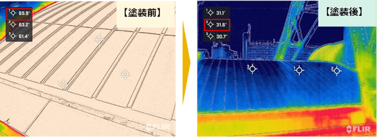 ▲塗装前後における屋根表面温度測定状況(サーモカメラ)