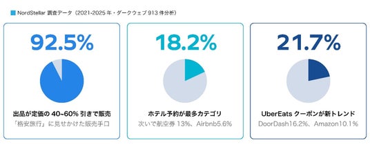 ホテル予約を不正購入してダークウェブ上で転売する「ダークウェブ旅行代理店」の実態が明らかになりました。出品の92.5%が定価の40~60%引きで販売されており、ホテル予約(18.2%)や航空券(13%)に加え、近年はウーバーイーツなどデリバリークーポン(21.7%)にまで取り扱いが拡大