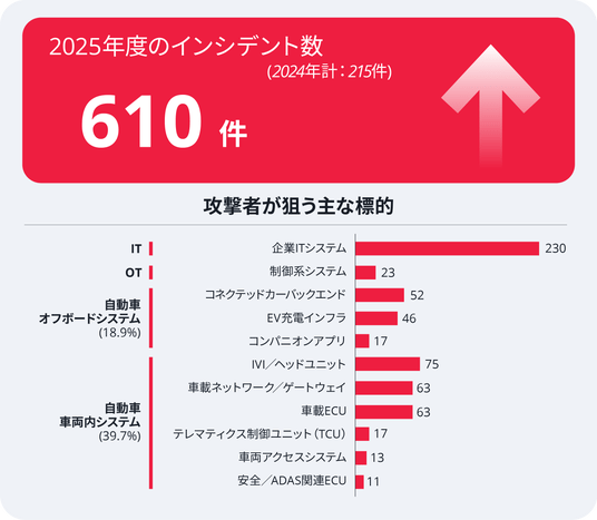 - 2025年に報告された自動車サイバーセキュリティインシデントの総数:610件(前年比 約2.8倍)