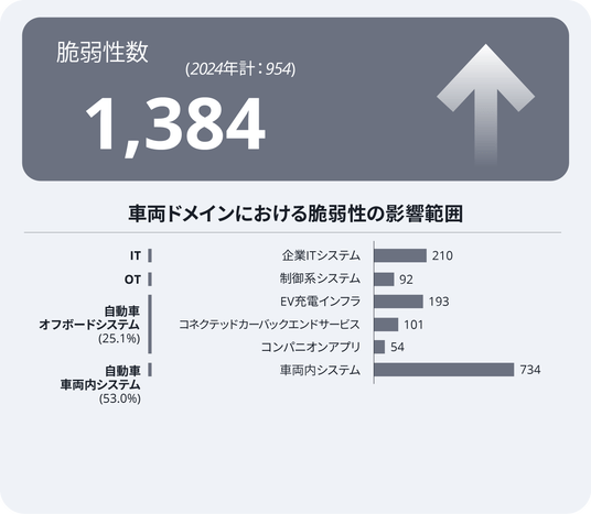 - 2025年に公開された自動車関連の脆弱性の総数:1,384件(前年比 約1.5倍)