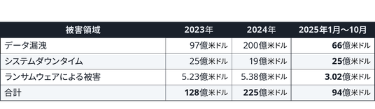 また、2025年1~10月のサイバーセキュリティインシデントによる推定損失額は約94億米ドルに達し、引き続き大規模な金銭的被害が発生しています。