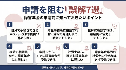 実際にどのような内容の「誤解」があるのか、以下に全国障害年金パートナーズが支援してきた顧客の声の中から、特に多かった誤解を7選としてまとめたものをご紹介します。