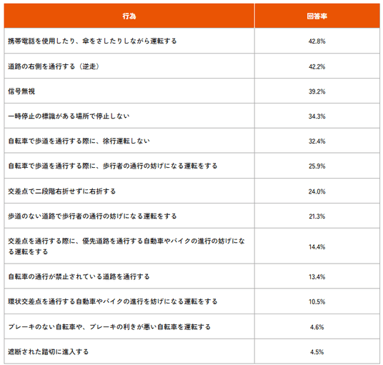 また、最も多かったのは、「携帯電話を使用したり、傘をさしたりしながら運転する」という、いわゆる「ながら運転」で42.8%でした【表3-2】。