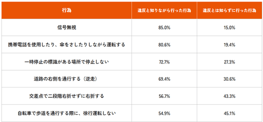 また、「信号無視」と「ながら運転」は、違反と知りながら行ったことがある行為としても多く、それぞれ85.0%、80.6%と上位を占めました【表5】。
