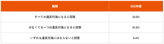 こうしたことから、制度の周知や対象となる行為の内容についての理解促進など、理解不足から違反してしまうことを防止していく取り組みとともに、違反だと認識したうえでの行為に対しては行動変容を促す取り組みを進めることも重要であると考えられます。