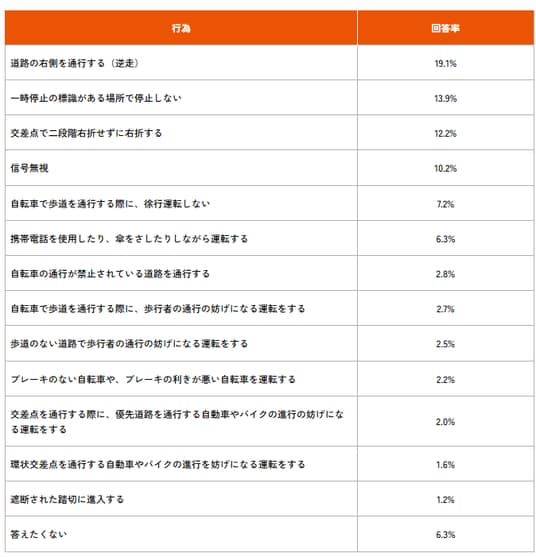 また、最も多かったのは、「道路の右側を通行する(逆走)」で19.1%でした【表2-2】。