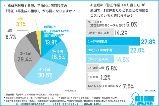 そこで今回、株式会社PRIZMA(https://www.prizma-link.com/press)は、「生成AI」を業務において日常的に利用し、「生成AIでの画像/動画制作」を業務において利用したことのある20~50代男女を対象に、「生成AIによる成果物の修正実態」に関する調査を実施しました。