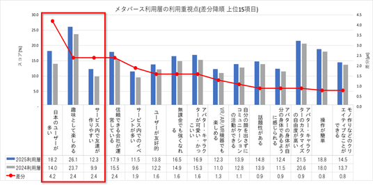 メタバース利用層の利用重視点では前年と比較して、「日本のユーザーが多い:18.2%(+4.2pt)」や「趣味として楽しめる:26.1%(+2.4pt)」、「サービス内で友達が作りやすい:12.3%(+2.4pt)」が伸長しました。”メタバース”では、様々な国籍のユーザーが集い、デジタルな肉体(スキン)を使って、共通の動作(エモート)を行うことで「グローバルな友達作りやコミュニケーション(異文化への出会い)」、「仮想現実への冒険」ができる場として注目されていましたが、現状日本国内では「日本語で友達作りができる日常空間」としての実用性を求め始めていることが窺えます。 一方で、AIによるリアリタイム翻訳の一般化によって、メタバース空間でのグローバルコミュニケーションが増加することを考慮すると、本傾向は今後変わる可能性が考えられます。