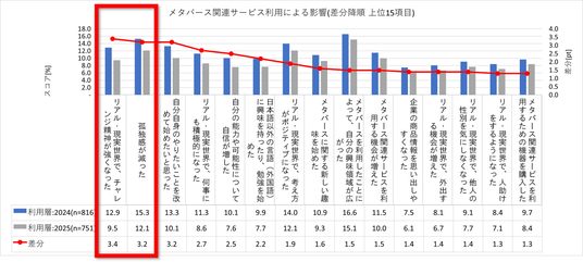 メタバースサービスが利用者に与えた影響を経年で比較したところ、「孤独感が減った」という回答は利用層全体で15.3%となり、前年(12.1%)から3.2ポイント増加しました。また、「リアル・現実世界がポジティブになった(+1.9pt)」といった項目もやや伸長しており、メタバースは単なる現実逃避の場ではなく、現実生活の精神的な安定を支える「心のインフラの場」として機能し始めています。さらに、「リアル・現実世界で、チャレンジ精神が強くなった」という回答は12.9%で前年から3.4ptスコアが増加しました。また、「自分自身のやりたいことを改めて始めたいと思った」も3.2pt増加しており、メタバースでの経験が現実世界での積極的な行動につながっている様子がうかがえます。