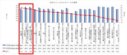 「自分にとってのメタバースの存在」について経年で比較したところ、「自分の別の可能性を見つけられる場」が66.4%(+5.7pt)、「現実世界の自分とは違う自分になれる場」が74.6%(+5.0pt)と上昇しました。「リアル・現実世界の知人・友人とは関係ない人たちと交流する場所」も74.3%(+5.3pt)と上昇しており、メタバースで出会った人たちとの交流や活動が、新たな自分の可能性の発見につながっていることが示唆されました。