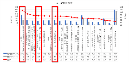 メタバース利用層のAIやNFT/暗号資産などの利用実態を確認すると、「AIを有料で利用する」は11.5%(全体4.5%)、「AIについて話すオンラインコミュニティに所属する」は9.7%(全体2.4%)、「暗号通貨を投資・投機目的で購入する」は23.3%(全体11.8%)と、全体を大きく上回っています。メタバース利用層は最新技術を単なる知識としてではなく、実益や創作活動のためのツールとして積極的に投資・活用している層であることが窺えます。 今後は、現実世界での生成AIサービス同様に、メタバース空間内で使える生成AI機能を実装することで、メタバース利用層はアバター衣装やワールド装飾などの生成・共有・販売など、メタバース内でのクリエイティブ/経済活動の発展に貢献してくれる可能性が考えられます。