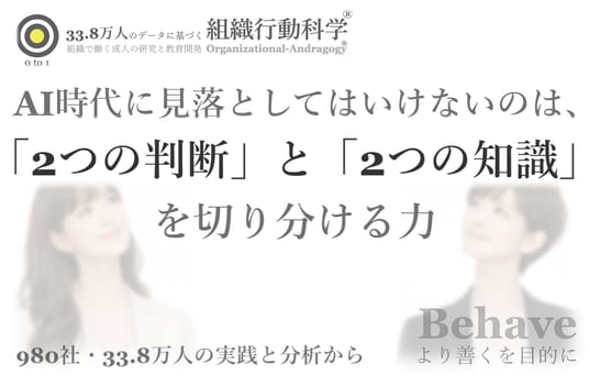 AI時代には判断が重要になる、経験が重要になる、という言い方自体は正しいものです。しかし、それだけでは、AI活用も、人材育成も、仕事設計も、すぐに抽象論になります。本当に必要なのは、判断にも二種類あり、知識にも二種類あり、その4つが仕事の中でどう組み合わさっているかを見抜くことです。