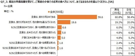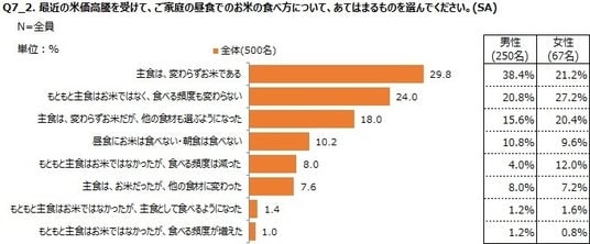 一方で「主食は、変わらずお米だが、他の食材も選ぶようになった」の割合が2番目に高く、主食に他の食材を選ぶようになった人も少なくなかった。