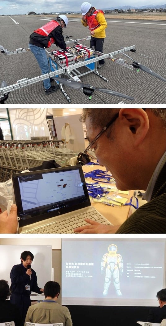 (写真上)福井空港でドローンの飛行試験を行う金沢工大のスタッフ。(写真中)坂井市内のショッピングセンターアミで独自のシステムによる実証を行うサイトセンシングの平林社長。(写真下)宇宙服の研究をベースに、スマートテキスタイルの開発などを報告するAmateseras Spaceの蓮見社長