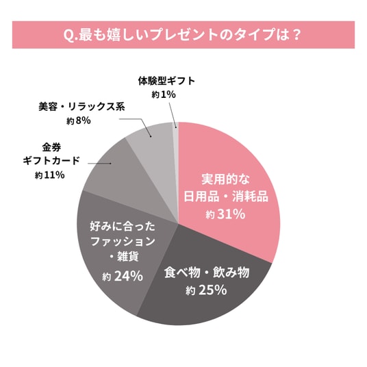 回答者に、「もらって最も嬉しいプレゼントのタイプは?」と質問したところ、「実用的な日用品・消耗品」(約31%)が最多で、「食べ物・飲み物」(約25%)、「好みに合ったファッション・雑貨」(約24%)が続きました。消耗品や食品は心理的負担が少なく、喜んでもらいやすい傾向が見られます。