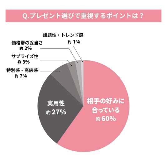 回答者に、「プレゼントを選ぶ時、あなたが最も重視するポイントは?」と質問したところ、「相手の好みに合っていること」が約60%と圧倒的に多く、過半数を大きく上回る結果となりました。次いで「実用性」(約27%)が続き、贈り物選びでは“相手理解”が最優先事項であることが明確になりました。