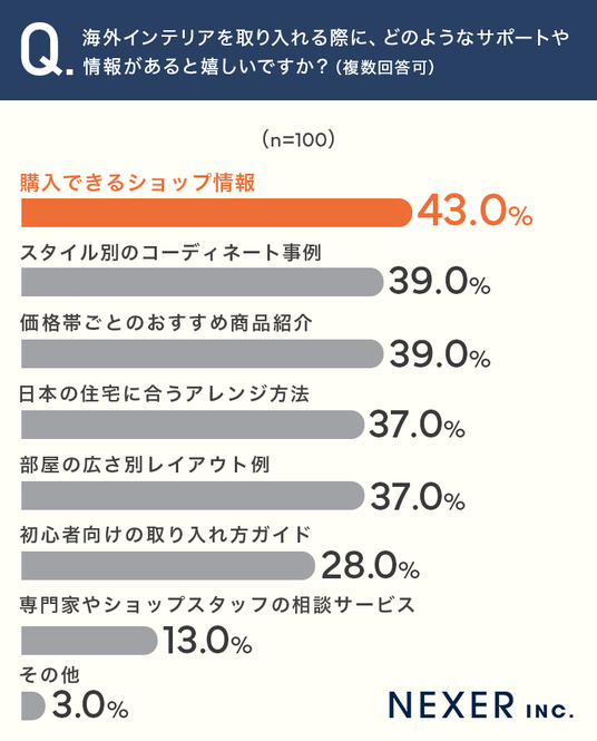 「どこで買えるのか」という情報ニーズが最も高く、海外インテリアに興味はあるものの購入先がわからないという方が多いことがうかがえます。