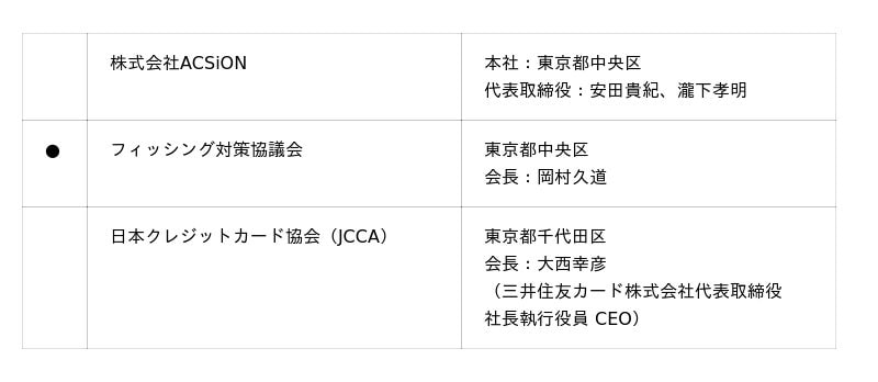 国内クレジットカード会社13社(「会社概要」参照)と株式会社ACSiON(以下、ACSiON)、フィッシング対策協議会および日本クレジットカード協会(以下、JCCA)は、クレジットカード情報の不正取得を目的としたフィッシング被害の抑止に向け、2025年4月より開始したクレジットカード会社共同によるフィッシングサイト閉鎖の取り組み(以下、本取り組み)を拡大します。