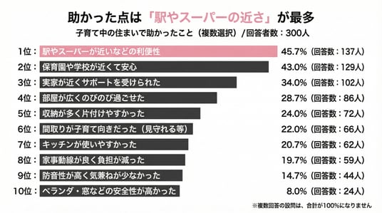 一方で、実際に助かった点は「駅やスーパーが近いなどの利便性」45.7%(137人)が1位となり、子育て期は「安全」と「生活利便性」の両面で住まいが評価される傾向が見えてきました。