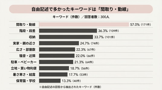 上位には「階段・段差」「収納」「スペース」「騒音」と、日常の安全や片付け、生活ストレスに直結する項目が並びました。設備の豪華さよりも、毎日の暮らしで事故やストレスを減らせる設計が重視されています。