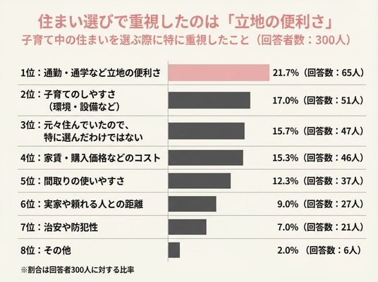 立地の便利さが最多となった一方、「子育てのしやすさ」「コスト」「間取り」も近い割合で続いています。単一の条件ではなく、複数の要素をバランスよく考えて決めている人が多いようです。