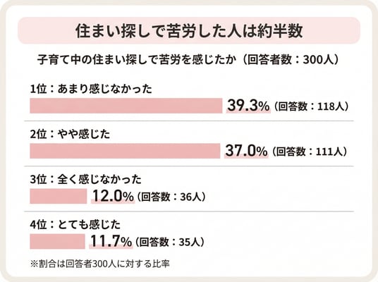 子育て期の住まい選びでは、情報収集や条件整理、現地確認などで負担を感じる人が多いことがわかります。一方、苦労が少ないと感じた人も同程度おり、家族のサポート状況や優先順位の明確さが影響している可能性があります。