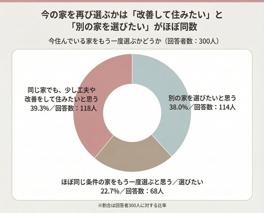 また「今の家をもう一度選ぶか」では、「同じ家でも工夫や改善をして住みたい」39.3%(118人)、「別の家を選びたい」38.0%(114人)とほぼ同数に。住まいに改善の余地を感じている人が多い結果となりました。