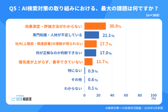 効果測定の難しさが最大の壁となっている点は、AI検索対策という領域の現在地を端的に表しているといえるでしょう。