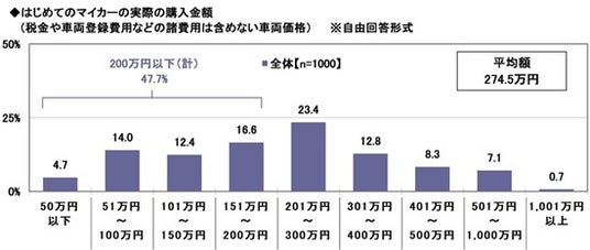 全回答者1,000名に、はじめてのマイカーの実際の購入金額(税金や車両登録費用などの諸費用は含めない車両価格)を聞いたところ、「201万円~300万円」(23.4%)に回答が集まり、200万円以下の割合は47.7%、平均は274.5万円でした。また、購入検討当初に設定した予算の平均(257.5万円)と比べると、実際の購入金額のほうが17.0万円高くなりました。