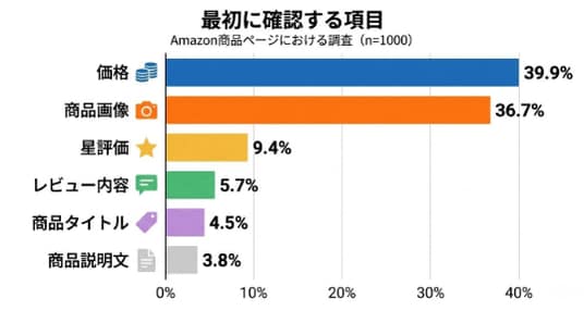 Amazonの商品ページを閲覧する際、ユーザーが最初に確認する項目についてアンケートを実施しました。その結果、「価格」が39.9%で最多となり、次いで「商品画像」が36.7%という結果となりました。