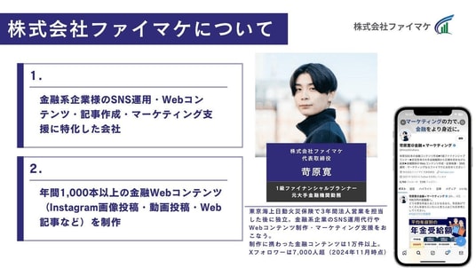株式会社ファイマケとは、金融機関のWebマーケティング支援に特化した会社です。代表の苛原は1級ファイナンシャル・プランナーの資格を有しており、年間1,000本以上の金融Webコンテンツを制作しています。