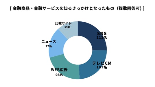 金融商品や金融サービスを知るきっかけとしては、「SNS」が最も多く、次いで「テレビCM」「WEB広告」「ニュース」「比較サイト」という結果になりました。
