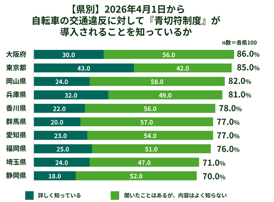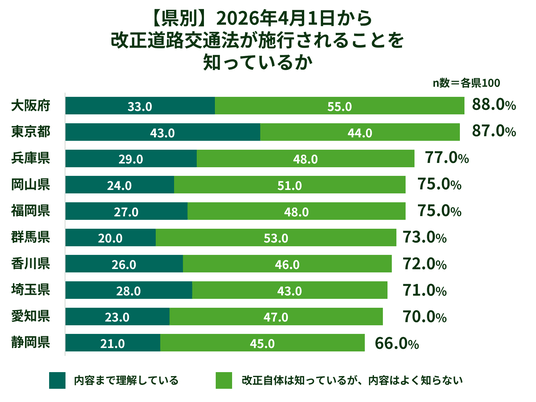 2026年4月1日から改正道路交通法が施行されることの認知は75.4%に達しました。しかし、「内容まで理解している」人は27.4%にとどまり、約半数が「内容はよく知らない」と回答して います。また、東京都や大阪府では内容の理解率が高い一方、岡山県や群馬県、愛知県、静岡県は 20%台前半と、地域差が見られる結果となりました。